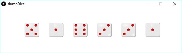 Ladda ner denna zipp-fil. I den finns kod och filer som visa hur man använder bilder på tärningar. Unzip det i lämplig mapp och öppnar slumpDice.pde. Gör om så det simuleras en tärningskast med 5 tärningar. Exempel